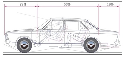 승용차 차체의 형태는 실내 공간, 엔진 공간, 화물 공간에 의한 레이아웃과 후드 : 캐빈 : 데크 간의 비율에 따른 차체의 종단면 형상(Profile)으로 특징이 나타난다. 이러한 차량 이미지의 전형성(典型性; Typicality)은 자동차 기업이 추구하는 기술 특성을 반영하고 있다. 이에 따른 승용차 차체 비례에 관한 기업의 개발 내용10)에 의하면, 전체 길이 대비 후드의 길이 비율이 25 %인 것을 중립적 비례로 보는 것이 보편적이며, 트렁크 비례는 후드 길이의 1/2을 중립적 비례로 본다.